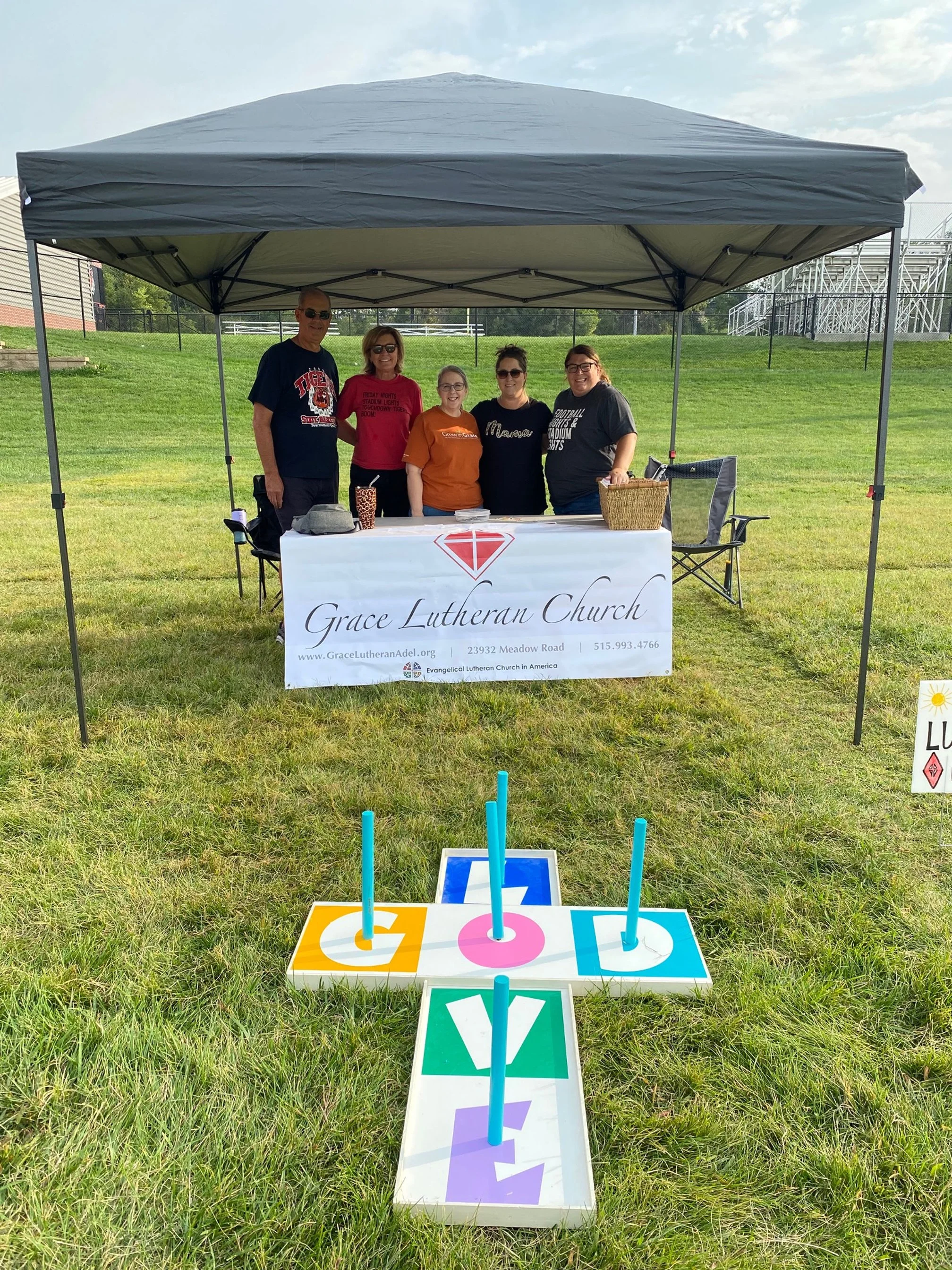 Thank you to Todd and Kim Nordquist, Susan Hannam, Jamie Loggins-Evans, and Pastor Tania for representing Grace Lutheran Church at TigerFest 2022! We had our cross-ring toss (see photos) as our game and gave away fun, inspirational, and spiritual stickers for kids water bottles or electronic devices. It was a fun and beautiful night spreading God’s love in our community!